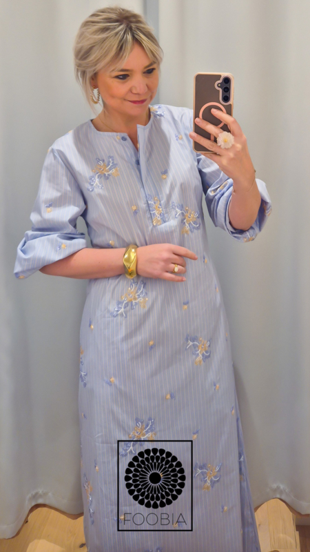 Een lang kleed in een luchtige stof, afgewerkt met fijne broderie en subtiele paillettes voor een elegante en glanzende uitstraling.