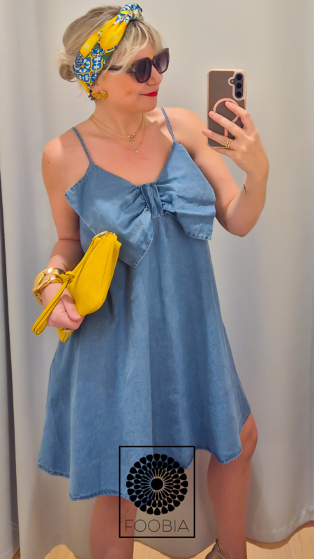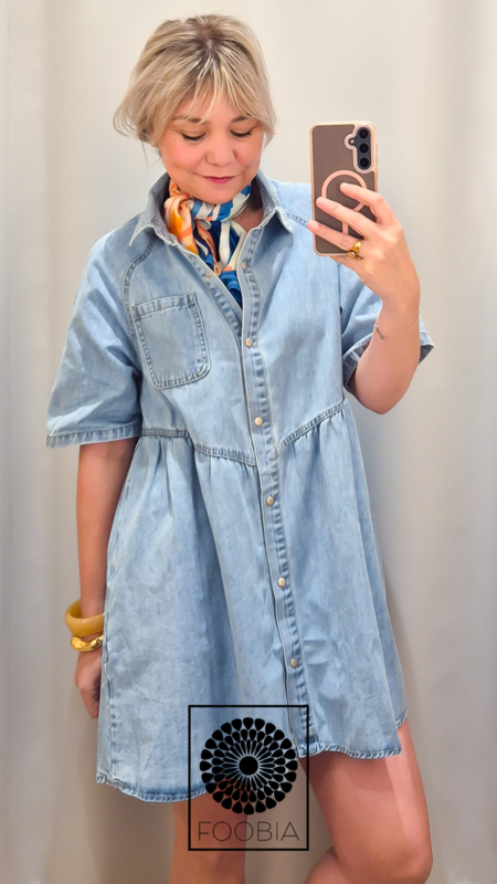 Dress CarlottaJeanskleedje met kapmouwtje en hidden pockets.