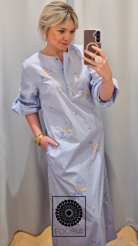 Dress MerelEen lang kleed in een luchtige stof, afgewerkt met fijne broderie en subtiele paillettes voor een elegante en glanzende uitstraling.