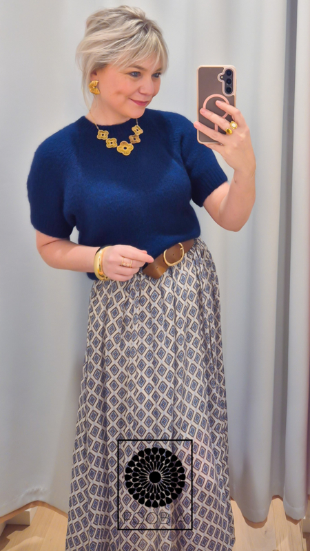 Korter model dus ideaal om te stylen op een hoge taille broek, rok of kleedje.